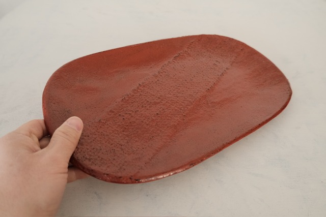 赤で仕上げた、御膳(長方形の大皿)。 根来塗ならではの奥行きのある質感があり、艶は強すぎません。 時間の経過とともに漆の透明感が増し、赤の表情に深みが重なっていきます。 横長のかたちで、一人分の膳としてはもちろん、 取り分け用の器や酒器をまとめて載せる場としても使いやすいサイズ感。 高さを抑えたつくりで、食卓に自然になじみます。 斜めにわたされた粗目の麻の布目が、表面に静かな表情を添えています。 和洋を問わず、日常の食事から来客時まで幅広くお使いいただける一枚です。 ________________ 木地に国産の桐材を用い、薄い布を張り、生漆による下塗りを重ねる。 さらに色漆を幾層にも塗り重ね、六度以上の塗り工程を経て仕上げる ——川勝五大氏ならではの技法から生まれる、 非常に軽く、断熱性に優れた漆塗りの器です。 削り出しの造形と、色の異なる漆を重ねて仕上げる「根来(ねごろ)塗り」による 陶器にも通じる独特の質感と奥行は 食卓の景色に奥行きをもたらし、盛り付ける食材の輪郭を自然に際立たせます。 その使い心地と表情には、国内外を問わずファンが多く ジャンルを超えた料理のプロフェッショナルからも高い評価を得ています。 <size> 約 36㎝×21.5㎝×h2.7cm <ご使用にあたって> 電子レンジ・食洗機はご使用いただけません。 通常の陶器などと同様に、食器用洗剤・お湯、ご使用いただけます。 スポンジ(やわらかい面)で洗い上げ、乾かしてからご収納ください。 漂白剤の使用や メラミンスポンジやクレンザーでの研磨は表面の塗膜を痛めますのでおやめください。 <作家プロフィール> 川勝 五大 (かわかつ ごだい) Godai Kawakatsu 石川県生まれ 1996年~ 父・川勝英十津の元で漆塗りの研鑽を積む 1998年 アメリカ・コロラド州の叔母宅にて生活、写真家の叔父のアシスタント生活から物造りの道へ進むことを決意 2004年 京都市立芸術大学彫刻科修了 2004年~ 京都・花脊の工房にてろくろ挽きから漆塗りまで器作りに専念する