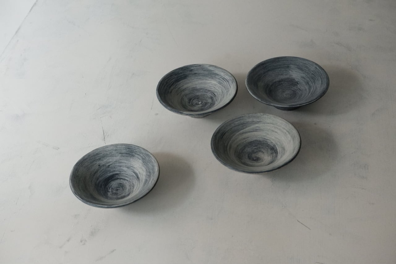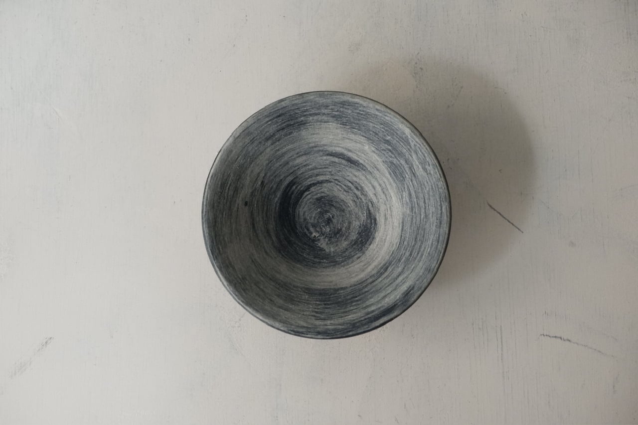 青地に白の刷毛目が走る、小鉢型のうつわ。