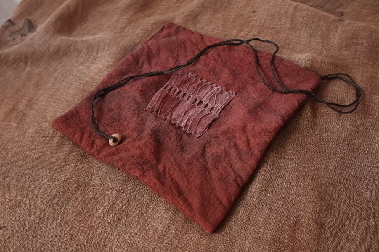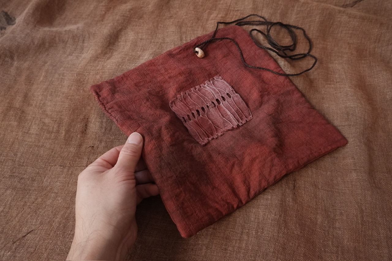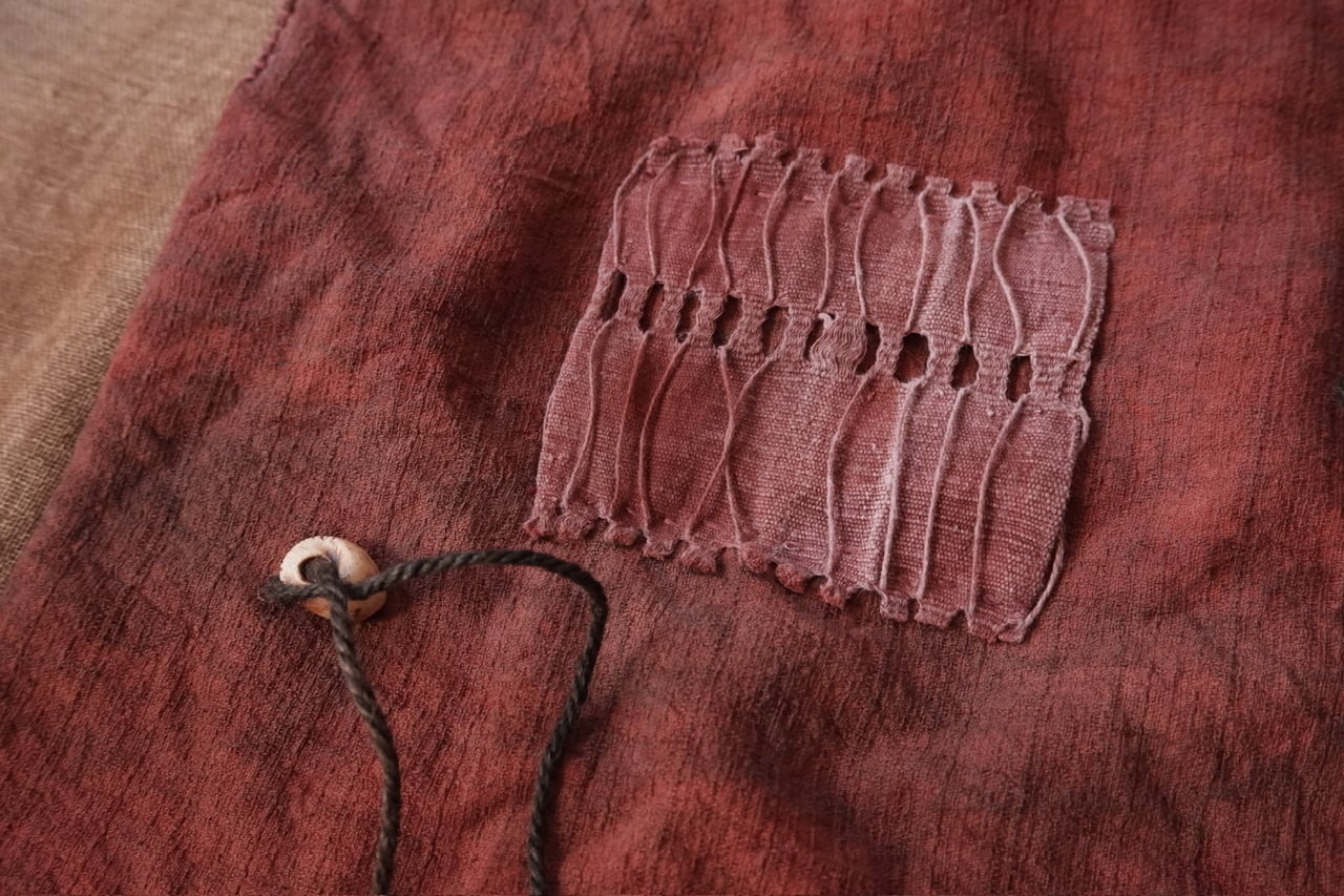 自らの手の感覚を頼りに、染色だけでなく蝋引きや縫いあわせ、風化と言った加工工程も組み合わせ作品をつくる。