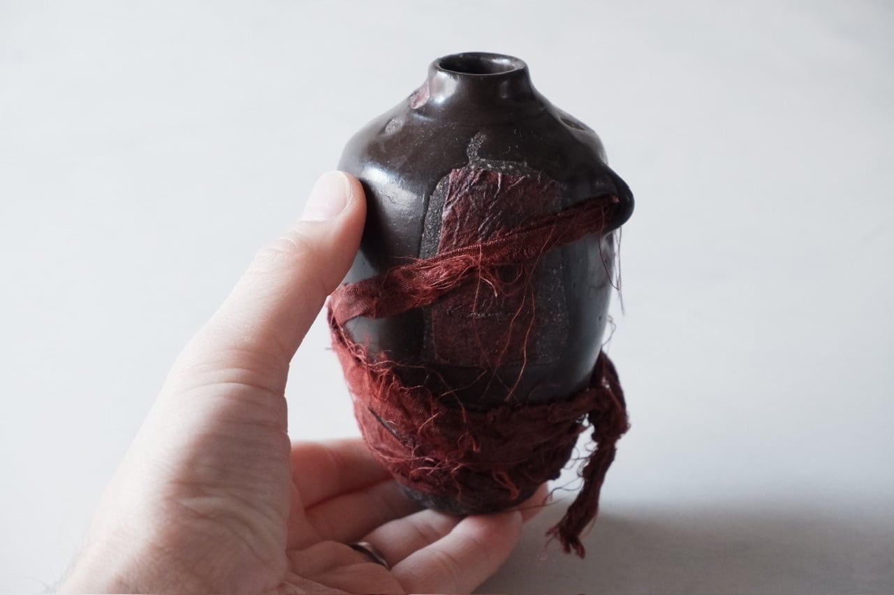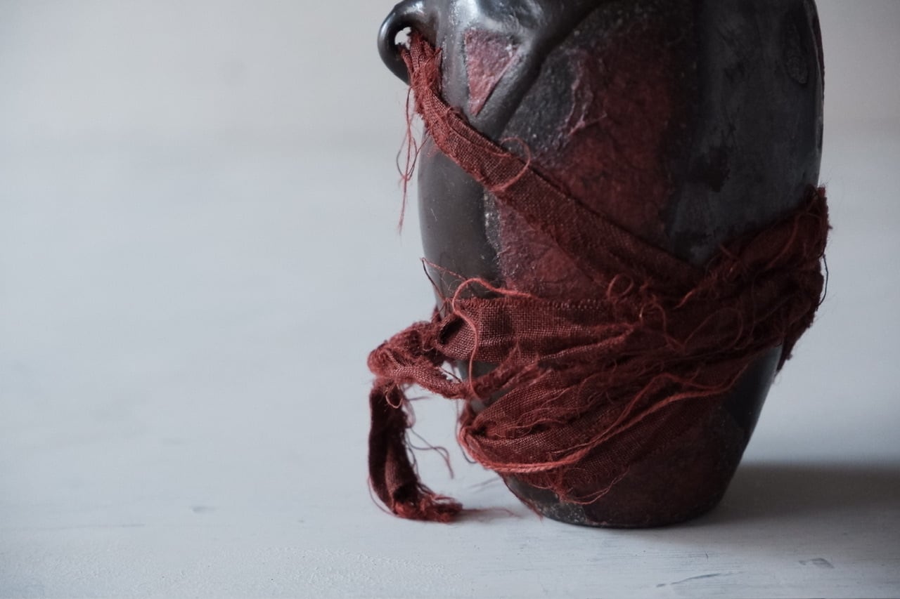 陶器を天然染料を用いて染めたり、染めた紙や布で装飾しております。