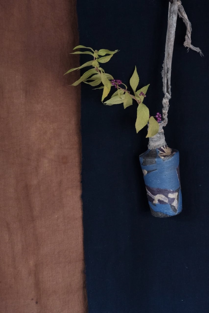 陶器を天然染料を用いて染めたり、染めた紙や布で装飾しております。