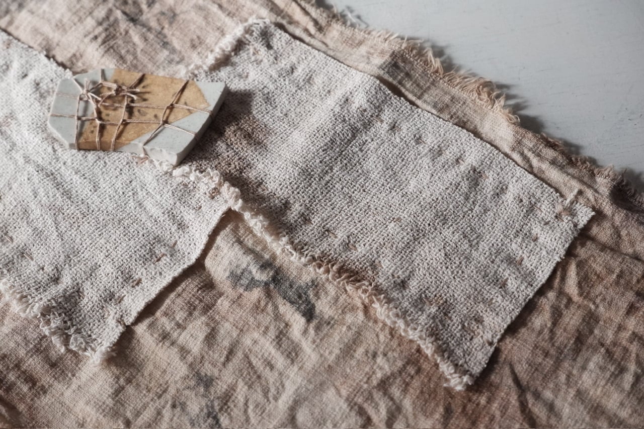 自らの手の感覚を頼りに、染色だけでなく蝋引きや縫いあわせ、風化と言った加工工程も組み合わせ作品をつくる。