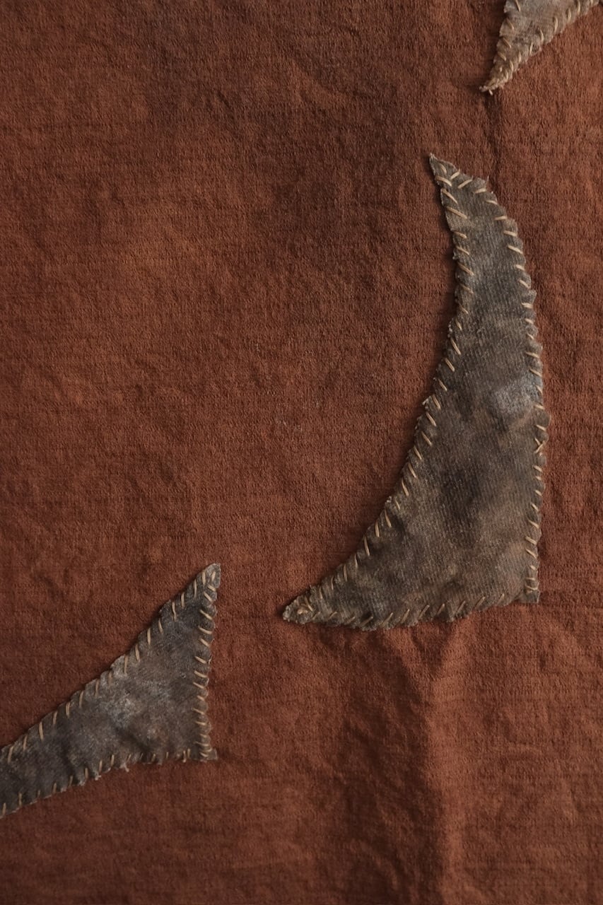 自らの手の感覚を頼りに、染色だけでなく蝋引きや縫いあわせ、風化と言った加工工程も組み合わせ作品をつくる。