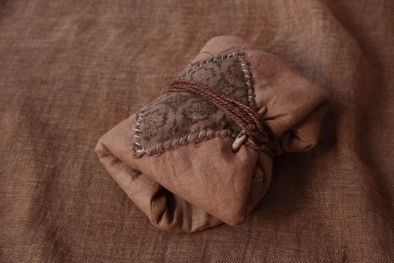 自らの手の感覚を頼りに、染色だけでなく蝋引きや縫いあわせ、風化と言った加工工程も組み合わせ作品をつくる。