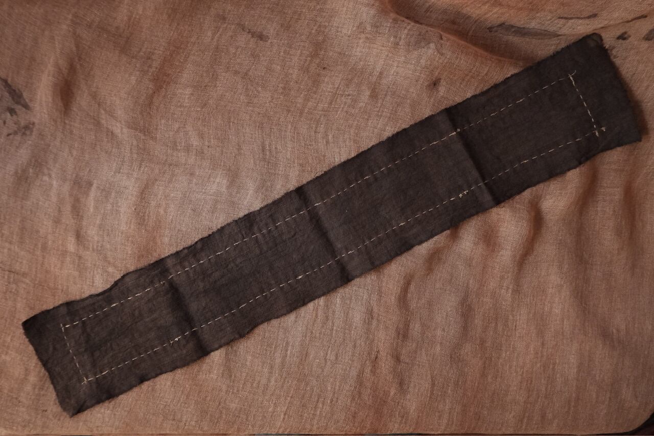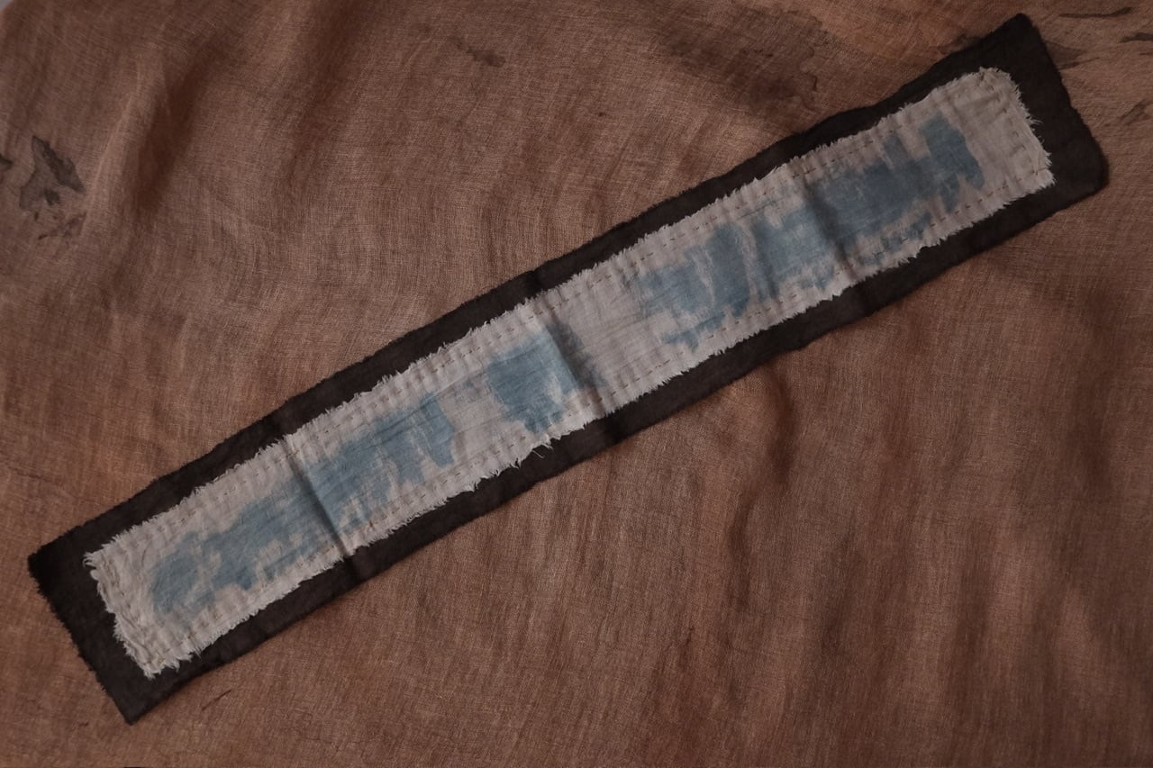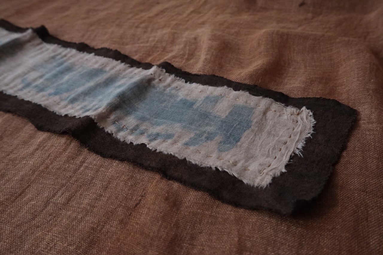 自らの手の感覚を頼りに、染色だけでなく蝋引きや縫いあわせ、風化と言った加工工程も組み合わせ作品をつくる。