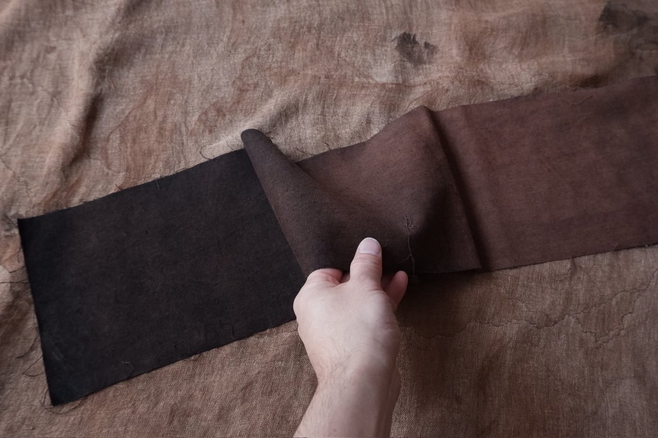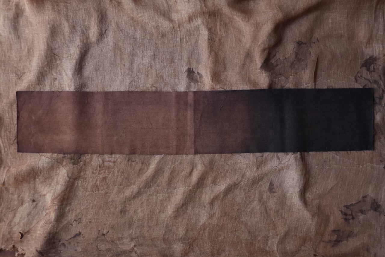 自らの手の感覚を頼りに、染色だけでなく蝋引きや縫いあわせ、風化と言った加工工程も組み合わせ作品をつくる。