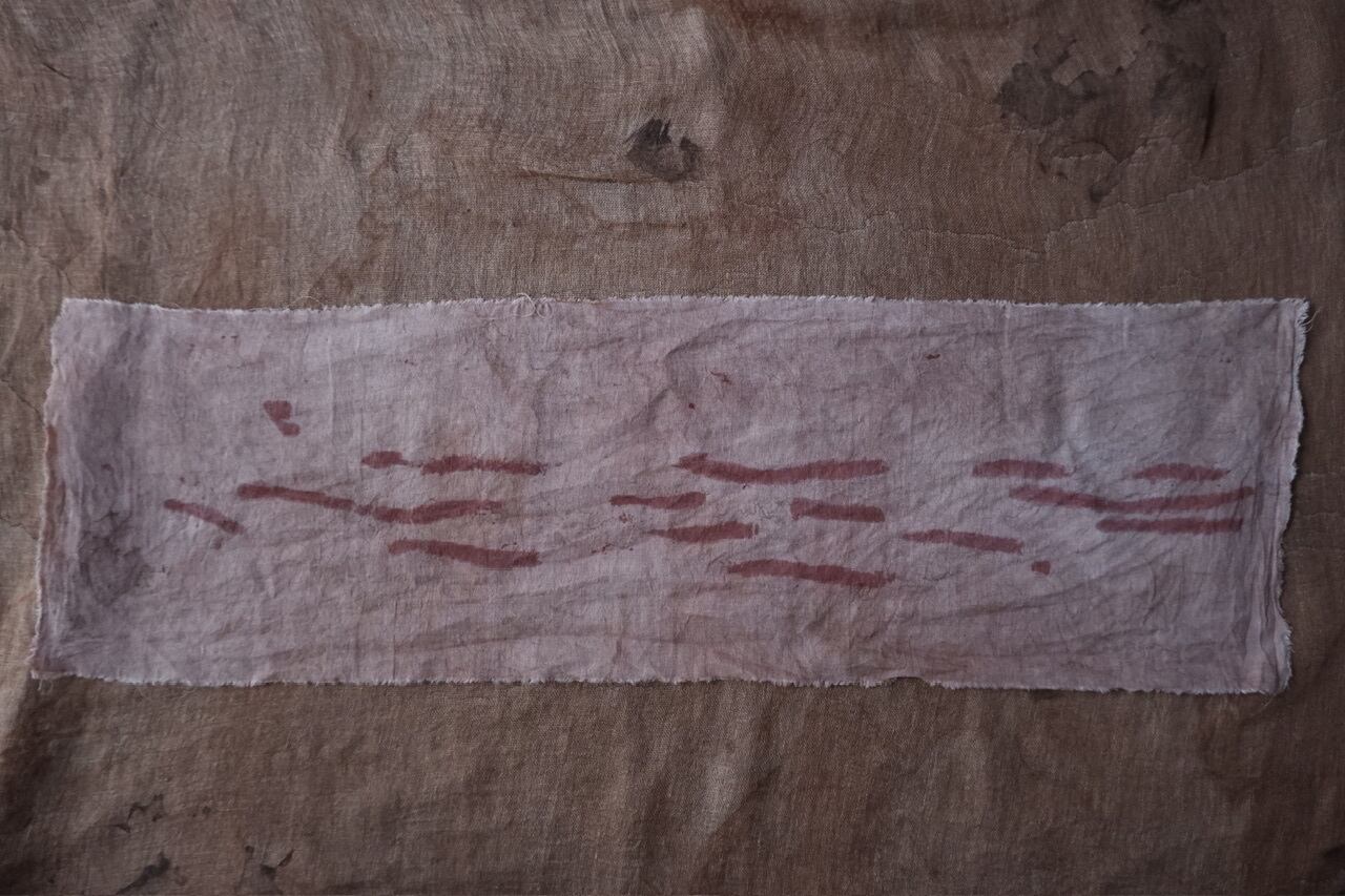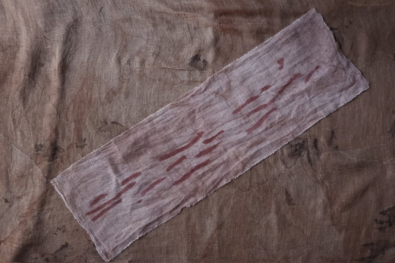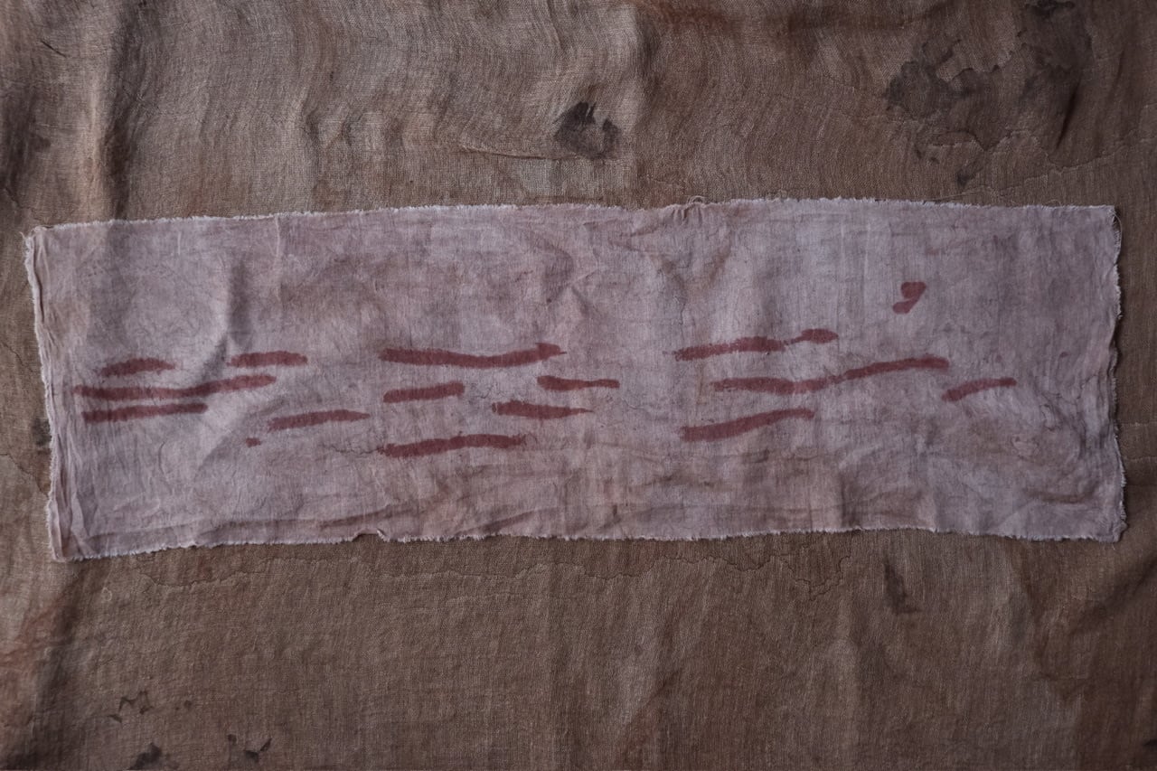 自らの手の感覚を頼りに、染色だけでなく蝋引きや縫いあわせ、風化と言った加工工程も組み合わせ作品をつくる。