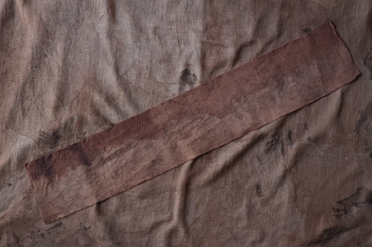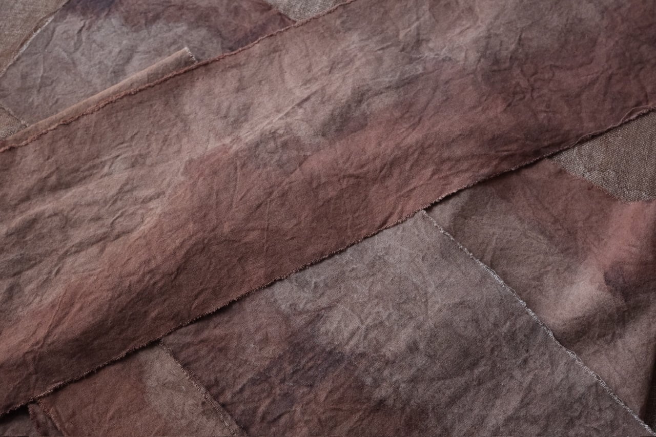 自らの手の感覚を頼りに、染色だけでなく蝋引きや縫いあわせ、風化と言った加工工程も組み合わせ作品をつくる。