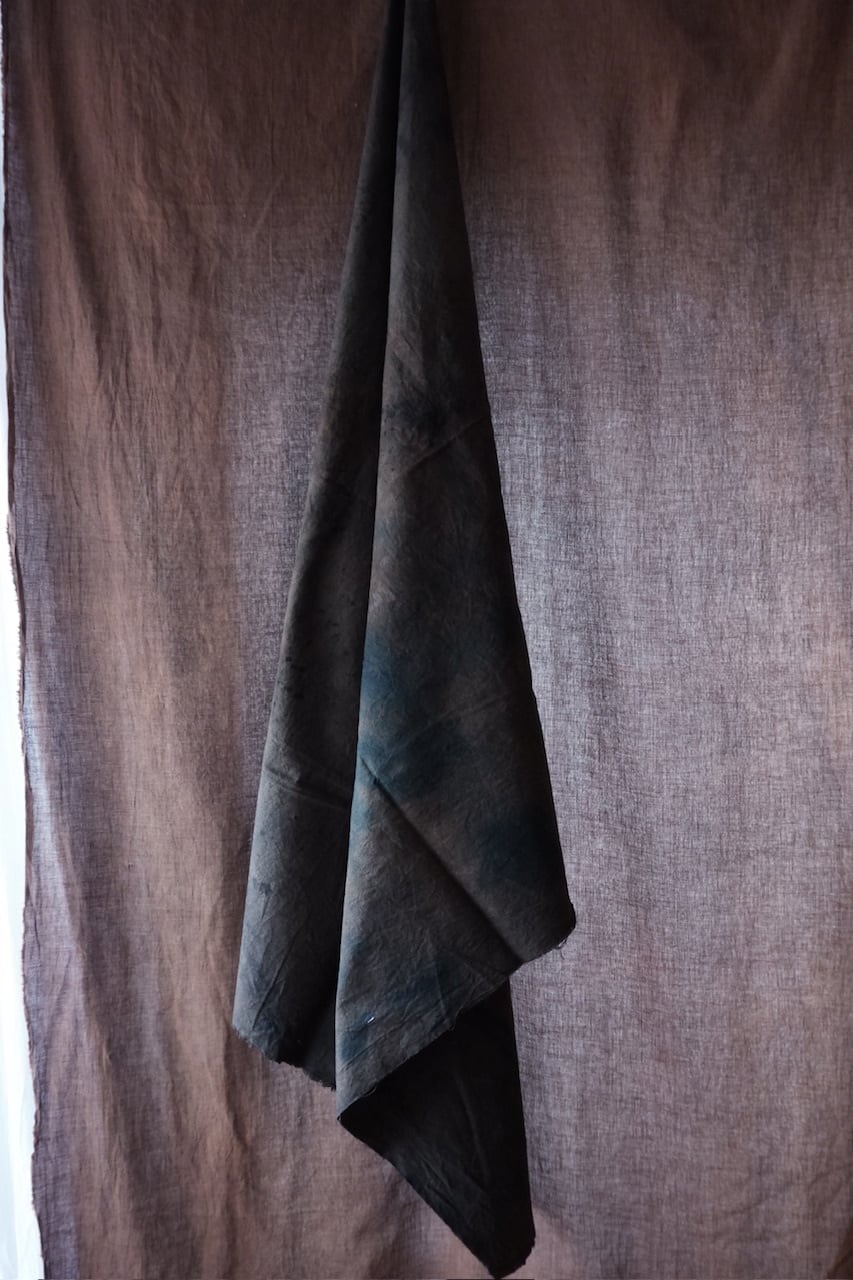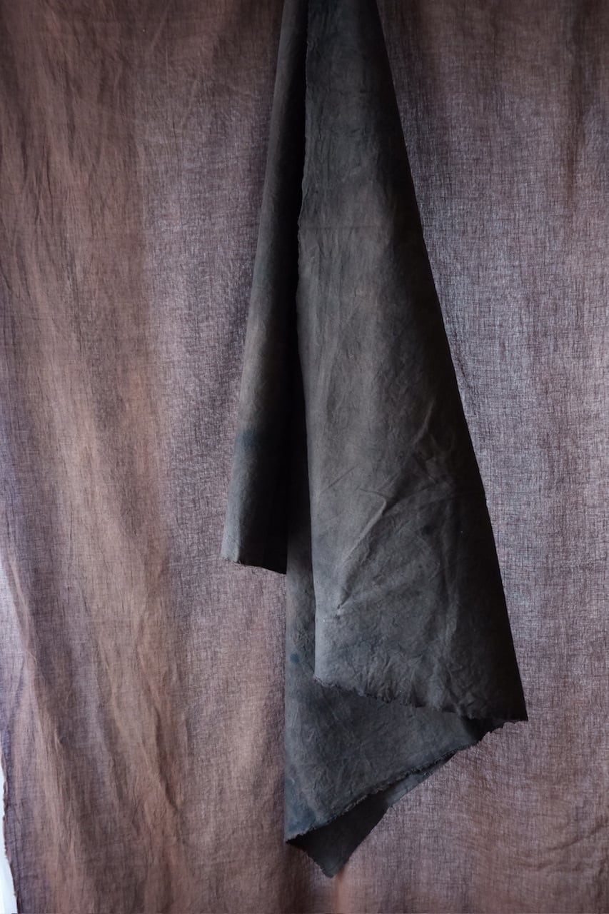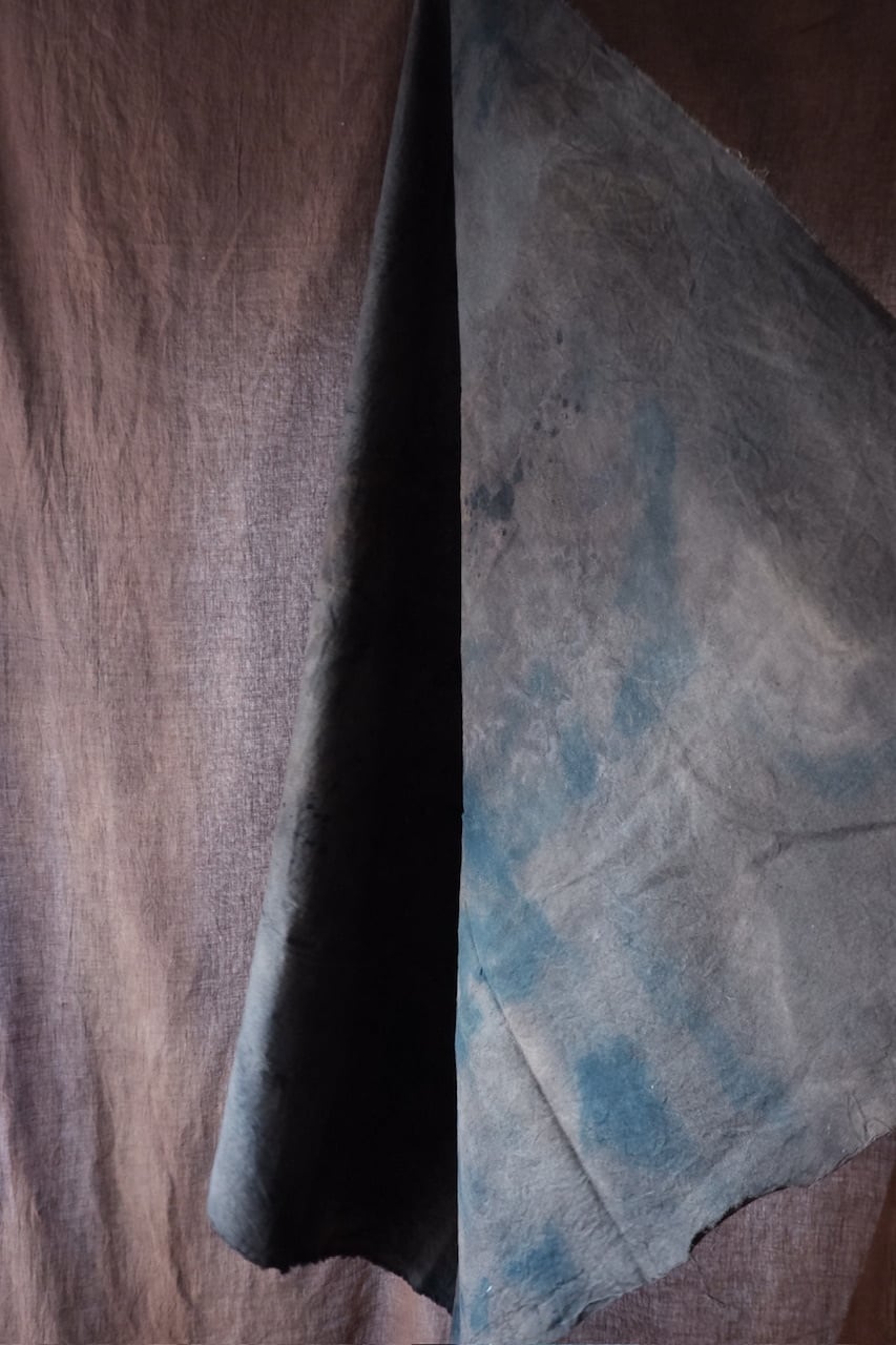 自らの手の感覚を頼りに、染色だけでなく蝋引きや縫いあわせ、風化と言った加工工程も組み合わせ作品をつくる。