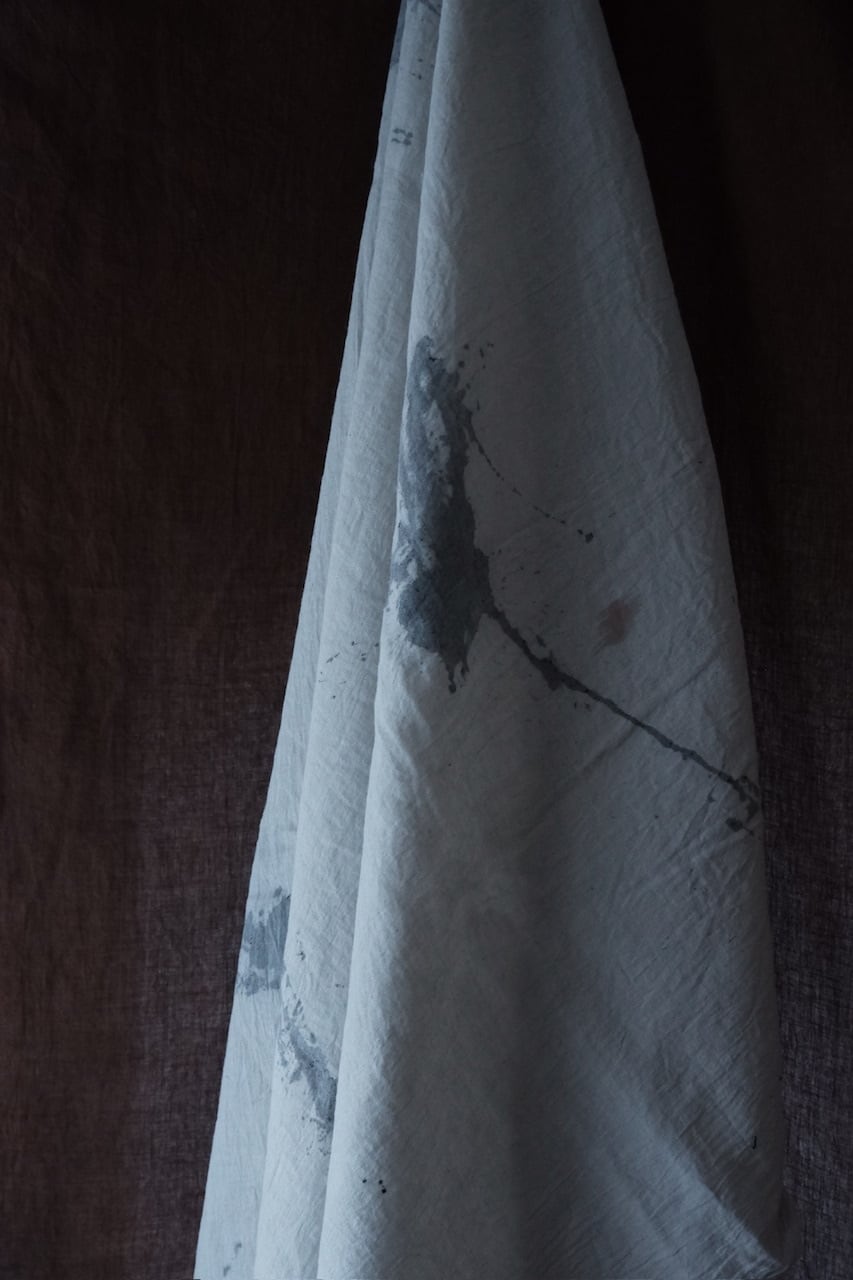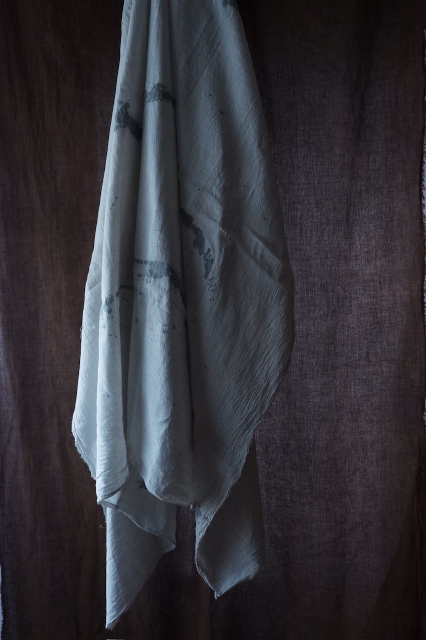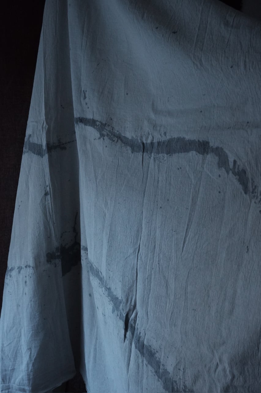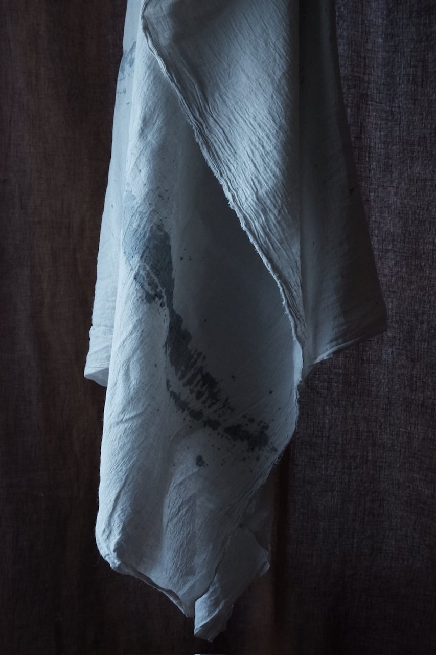 自らの手の感覚を頼りに、染色だけでなく蝋引きや縫いあわせ、風化と言った加工工程も組み合わせ作品をつくる。