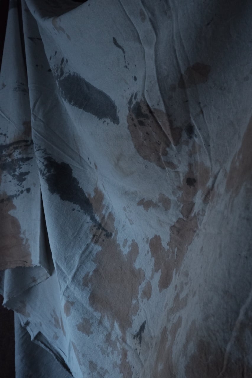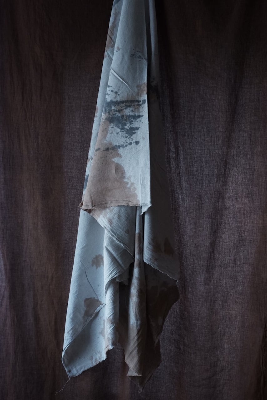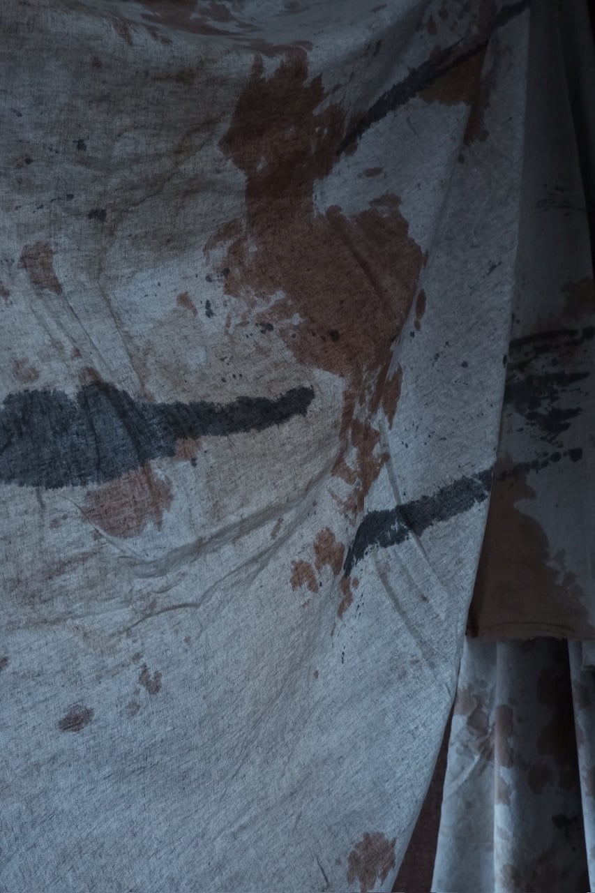 自らの手の感覚を頼りに、染色だけでなく蝋引きや縫いあわせ、風化と言った加工工程も組み合わせ作品をつくる。