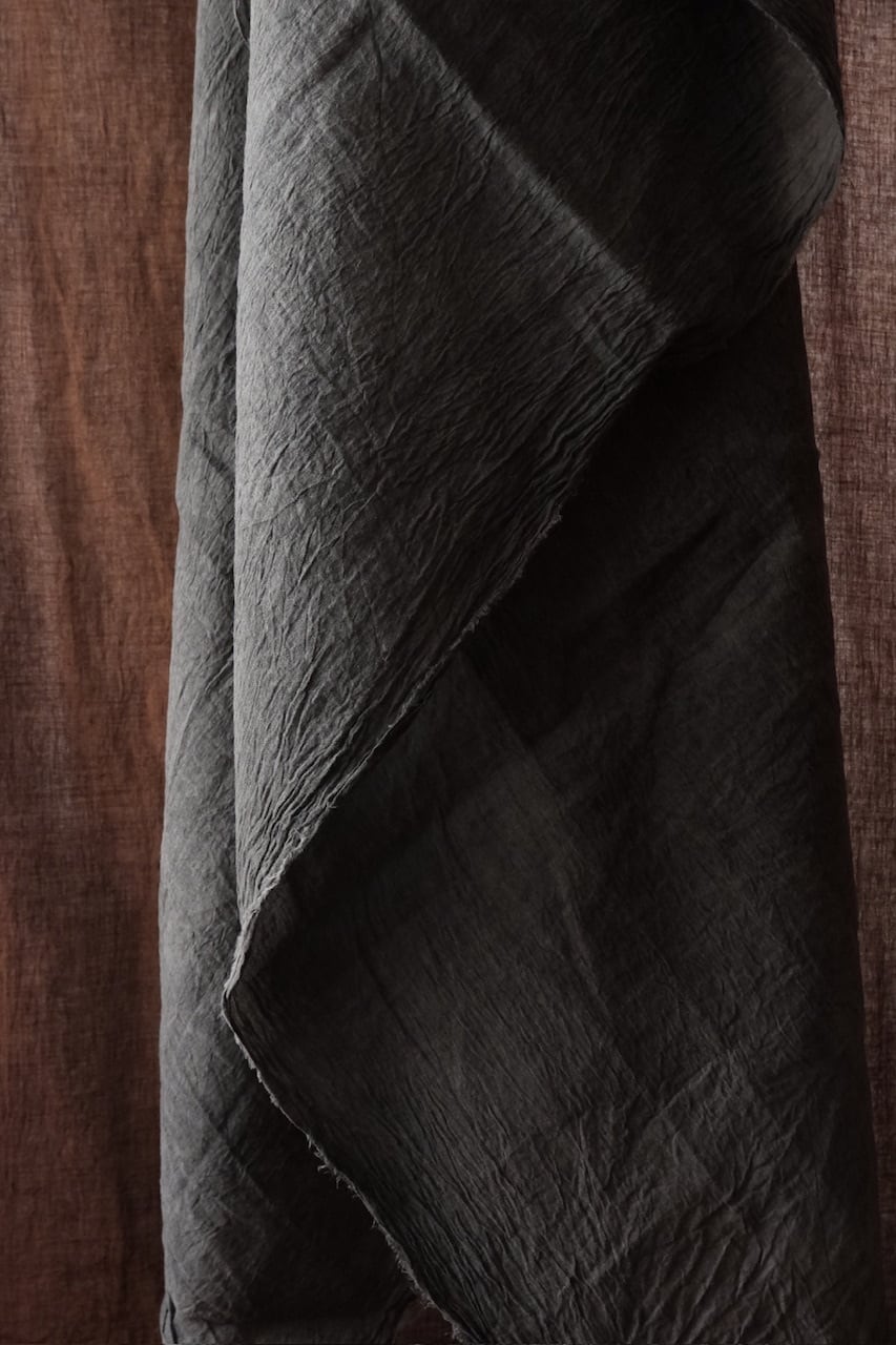 自らの手の感覚を頼りに、染色だけでなく蝋引きや縫いあわせ、風化と言った加工工程も組み合わせ作品をつくる。