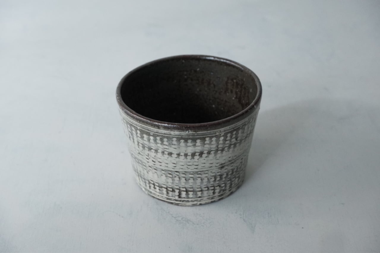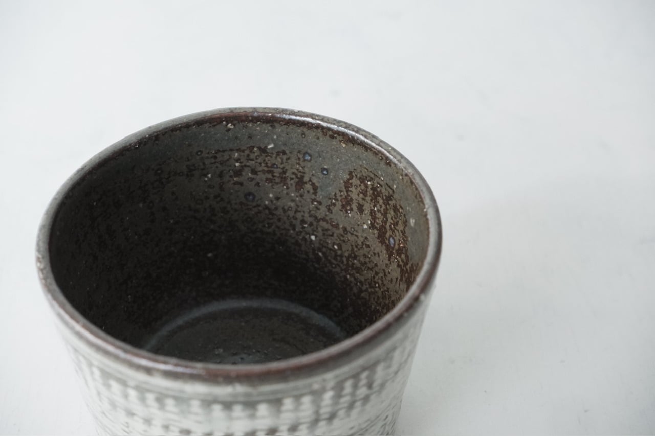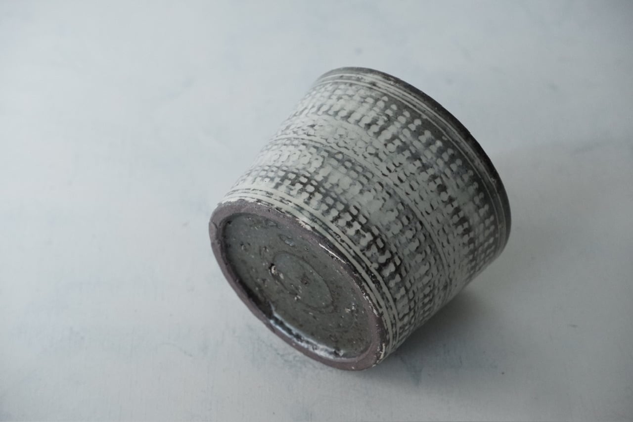 さりげない三島の文様が料理、飲み物を引き立てる猪口です。