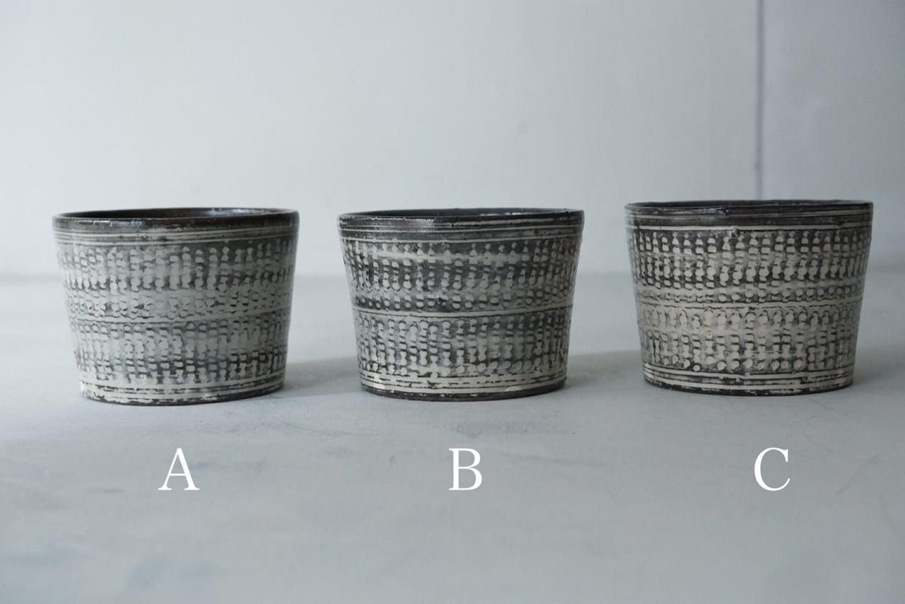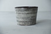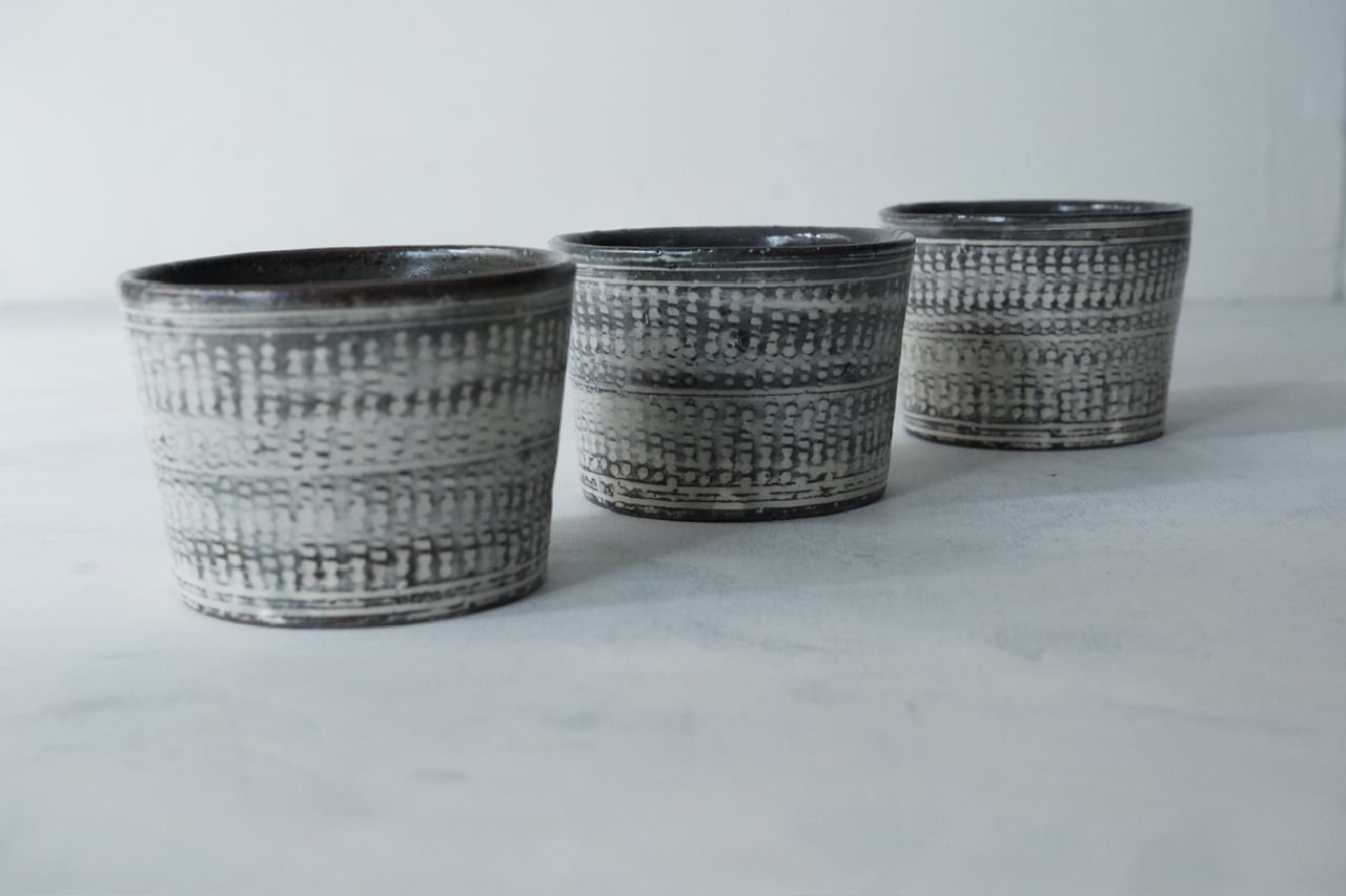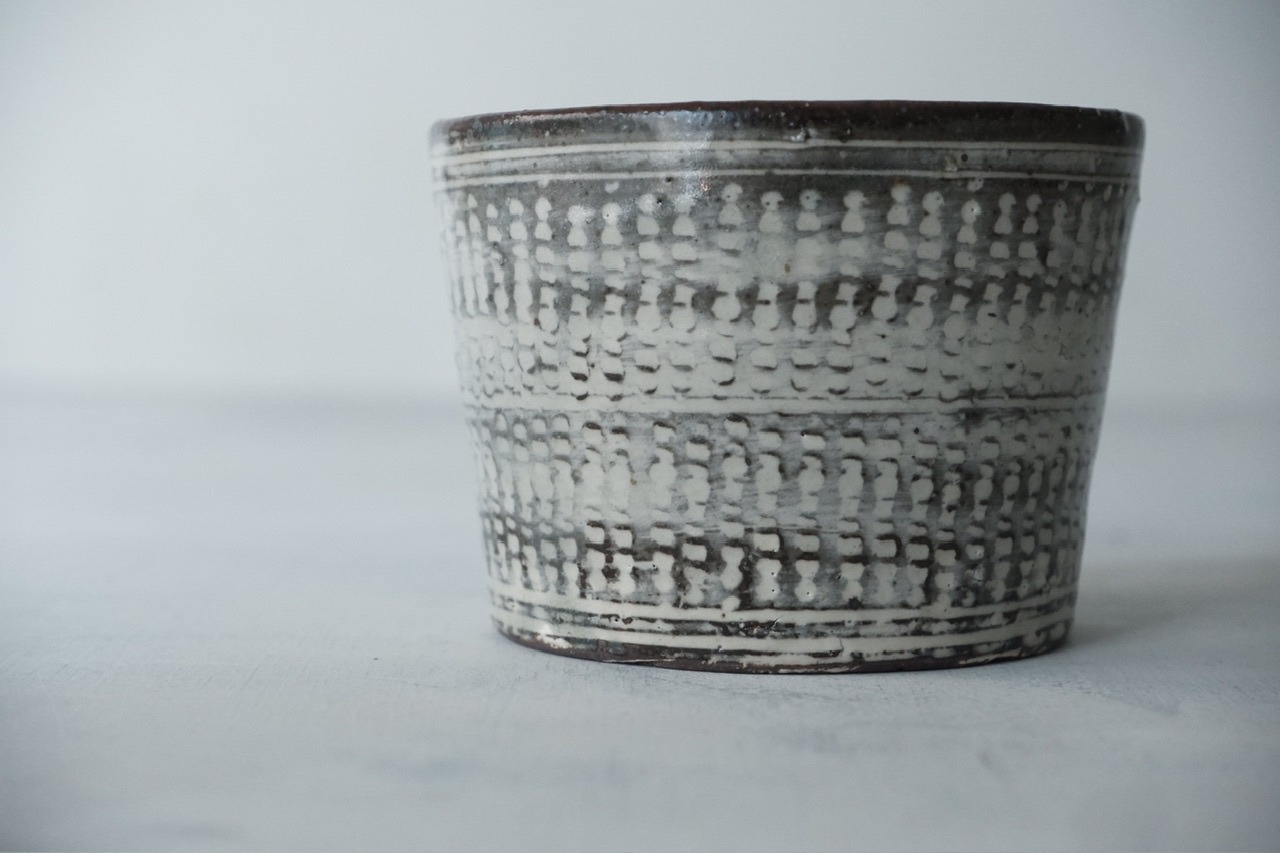 さりげない三島の文様が料理、飲み物を引き立てる猪口です。